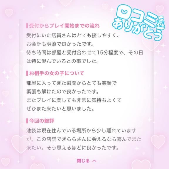 おはよー!きららです本日15時までいますスタートから本指様ありがとうございました!本日もご指名、ご予約お待ちしてます!!この前スタッフさんから口コミ書かれてたよー!と言われたのでみてみたら嬉しい口コミが!!ありがとうございます楽しんでくれてよかったです!住んでる所が遠いみたいですが池袋に来た際にはぜひまた遊びにきてくださいね女の子ページへ http://365diary.net/YkR0OEU4L3R0L2hhbmRfY2FtcHVzLzQyODM2NzQ0