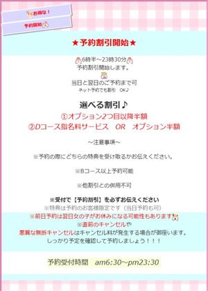 『みやび』です今日以降会いに来るなら絶対に予約必須??な割引始まりました????詳しくは画像見て欲しいんだけどいっぱい、いろんなことしたい変態くんたちは5分前でも予約した方がお得よ!①割引対象が前日予約だけでなく当日予約でも対象、何時の予約でも割引対象!②割引について Bコース・Cコース→オプション2個目以降半額 Dコース→指名料サービス OR オプション1個目から半額③15:00以降のシティヘブンのネット予約が可能!受付で【予約割引】と伝えたお客様のみ割引対象になりますのでしっかり伝えてね??年明けはちょっと体調崩してたんだけどだいぶ回復したから、あけおめ言いに来てね???女の子ページへ http://365diary.net/Rlg3OVlDL3R0L2hhbmRfY2FtcHVzLzUyNjczNjU1
