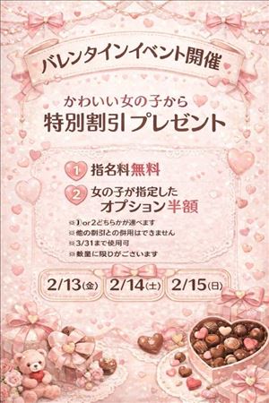 出勤しておりますー。なんか、バレンタインイベントやってるらしいです。指名料無料or指定オプション半額になる割引券、もらえますヨ!ラストまでいますんで、会いにきてもらえると喜びます…!!(イベント中、日曜日もいるよ。)?女の子ページへ http://365diary.net/ME9HbzR6L3R0L2hhbmRfY2FtcHVzLzU2ODQyNjI3