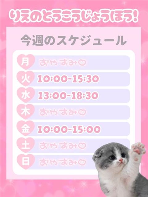 こんにちは!りえですみんな三連休なにしてたー?りえはお部屋のお掃除した!大掃除やりきれなかったので時間見つけてちょこちょこやってる、、笑お仕事のお兄様もいるよね!?ほんとにお疲れ様です今週の登校日まとめてみたー!明日のお時間少し変わってるのでよろしくお願いしますすでにご予約くれてるお兄様ありがとう今週は登校少なめ時間短めなので前日も当日もご予約がおすすめ!だってお得だしほんっとにどうしようもない時以外は滅多に当欠することもないので安心して予約してね!笑ディープキスと乳首舐めが大好きなのでつけてくれたら大喜び笑あと水曜日はいつもより遅くまでいるのでお仕事終わり来れるよってお兄様もぜひお待ちしてます03-3987-0450いっぱいいちゃいちゃしようね女の子ページへ http://365diary.net/Zk4xYTdkL3R0L2hhbmRfY2FtcHVzLzU4NTM2MDU3