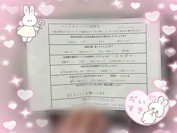 こんにちは、みさきです(?’?’? )??とっても嬉しいアンケートをありがとうございました??「次回は絶対指名します」「最高だった」って書いてくださっていて、読んだ時、胸がじんわりあったかくなりました(?????)?オプションも付けてくれて、「付けて良かった」って思ってもらえたのも本当に嬉しいです。お兄さんの大事な時間を、みさきと一緒に過ごしてくれてありがとう??こうして言葉にして伝えてもらえると、もっと頑張りたい、次に会えたときはさらに幸せにしたいって思います(?’?’? )??またいつでも会いに来てくださいね?お兄さんに会える日を楽しみにしています。?みさき女の子ページへ http://365diary.net/dXEyOWdGL3R0L2hhbmRfY2FtcHVzLXNoaW5qdWt1LzU0NzQzNTYx