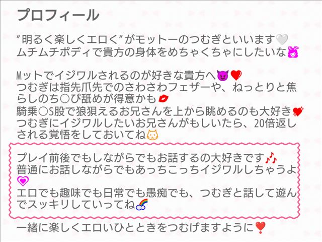 どうも! おしゃべり責めMットプレイヤー つむぎちゃんです 何だこの…肩書き? シティヘ○ンのこのプロフィールは つむぎが好き勝手に書いている自己紹介です たしか春くらいに書いてた気がします プロフィールそんなに読まない派の方は つむぎのプレイで驚くかもですが、 読む派の方にもまあまあ驚かれます笑 『本当に話しながらここまでするんだ…!』と 最近も驚きをご提供しました どこまでもやっちゃうよ! 日常会話もお悩み相談も猥談も言葉責めも つむぎちゃんにおまかせあれ おしゃべり+焦らしプレイで そーろーさんもじっくり楽しんでね もしお喋り控えて欲しいと言われたら がんばって40%くらいに抑えます がんばれたらね! お話し好きなビンカンさんと 出会えますように つむぎ スイカ出没予定 10月09日(木) 14時~21時 10月10日(金) 14時~21時 10月14日(火)~20日(月)は工事の為店舗休業   女の子ページへ http://365diary.net/WUtyU1U2L3R0L3N1aWthLzMzMzcxNjI3