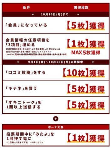 こんばんはシティヘブンで開催される全国ミスヘブン総選挙2023にスタイル部門から出場させていただくことになりましたお店からはほかにも出場されるおんなのこさんがいらっしゃいます。みなさまからの投票がおんなのこさんへの応援という形になります。その投票をする為には投票チケットが必要です。投票チケットを獲得する方法はたくさんあります投票チケット獲得期間は10月16日月曜日までです。10月になりましたので獲得期間は残りわずかです10月16日までにシティヘブンの会員登録をしていただくと5枚会員情報を3項目入力していただくごとに最大で5枚チケットを獲得できます。さらに10月16日までに口コミ投稿キテネの受けとりオキニトークを1回以上送信をしていただくとそれぞれチケットを獲得できますこれらをすべてご協力してくださると最大30枚のチケットを獲得することができます投票チケットを使用して10月30日から11月5日までの投票期間におんなのこさんを応援することができるのです。おなじおんなのこさんへは1日3票まで投票することができますそしてこの投票期間中はおんなのこさんへみたよを押していただくと1日最大5枚チケットを獲得できます。みたよは0時にリセットされるので時間にお気をつけくださいこちらも合わせると獲得チケットが最大65枚です長文になってしまい失礼しました。文がまとまっておらずむずかしい部分もあったとおもいますもしわからないことがありましたら気軽に質問してくださるとうれしいです。これからも定期的にミスヘブンについての日記を書かせていただくことになるとおもいます。みなさまにもおつきあいいただけたらとおもいます。あらためてみなさまの応援とご協力をよろしくおねがいします。シティヘブンについてはじめて知ったという方ぜひ会員登録のご検討からおねがいします。女の子ページへ http://365diary.net/WWpiMFhPL3R0L3N1aWthLzM4NzUxMDgy