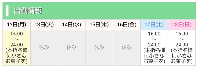 こんにちは 本日16時から出勤させていただきます。 ご予約してくださりありがとうございます。 いらっしゃる日がついにやってきたのだ とおもうと 緊張してしまいます でもうれしいです。 ありがとうございます 明日から ふたたびすこしお休みをいただきます。 次回の出勤予定は 17日16時からです。 よろしくおねがいします。 お店では 15日木曜日までの限定で割引券名刺をお渡しております。 19日月曜日までの出勤期間は じぶんを本指名してくださった方に ちいさなものですがお菓子をお渡ししたいとおもいます。 もしよろしければ 受けとってください。 今月も シティヘブンのオキニトークから ご希望日の2日前までにオキニトークからご予約をしていただくと 60分コース以上で指名料金が無料のイベントを開催しております。 お店での 前日予約と当日予約も 通常どおりご案内しておりますので 今日ご都合にもし合いましたら よろしくおねがいします。 直近7日間の出勤予定 15日木曜日はお休みをいただきます。   女の子ページへ http://365diary.net/UDgxU1BKL3R0L3N1aWthLzM4NzUxMDgy
