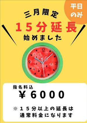 こんばんは 3月開催のイベント オプションサービスのほかにも 増えたものがあります 延長サービスの時間に [15分]が追加されました。 通常は 延長時間は30分から可能なのですが 今月は平日限定で 15分の延長を用意しております! ご指名料金をあわせて 6000円でのご案内です。 お支払方法は現金のみです。 15分延長は お一人様1回のみです。 ぜひ覚えていていただけるとうれしいです。 よろしくおねがいします。     継続決定のイベント https://sp.suika-g.net/suika/girl/1253/blog/2000137.html   女の子ページへ http://365diary.net/TkQwdXVqL3R0L3N1aWthLzM4NzUxMDgy
