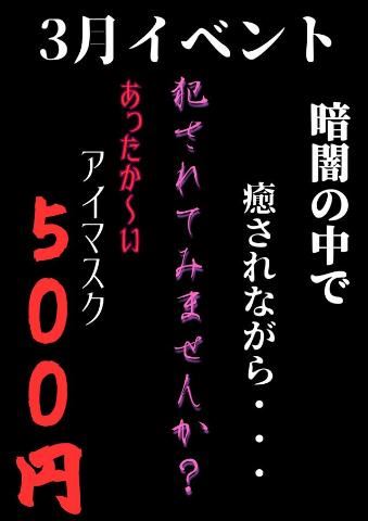 みなさまこんばんは 今月限定で増えているオプションサービスは Tバックショーツと もうひとつあります ホットアイマスク 500円 です。 ホットなアイマスクなのだそうです 目をたくさん使用する日常をおくられている方 現実を見ることをすこしお休みしたい方 もしよろしければ いかがでしょうか お店スイカで用意しているオプションサービスは ■ストッキング 1000円 [パンティーストッキング・ガーターストッキング] ■マイクロビキニ 2000円 ■Tバックショーツ 500円[3月限定] ■ホットアイマスク 500円[3月限定] です。 よろしくおねがいします。     3月平日限定のイベントはこちら https://sp.suika-g.net/suika/girl/1253/blog/2000128.html   女の子ページへ http://365diary.net/N2Y4aU5KL3R0L3N1aWthLzM4NzUxMDgy