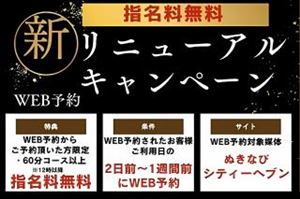 みなさまこんにちはお店スイカでは本日から期間限定の割引イベントを開催しております。Web予約リニューアル記念イベントですぬきなび関東とシティヘブンでのWeb予約が一週間前から可能になりましたパワーアップしたWeb予約リニューアルを記念して本日1日 月曜日から8日 月曜日の中で足をはこんでくださる方で事前にWeb予約をしていただき60分コース以上をご利用で指名料金が無料ですイベント参加ご希望の方はぬきなび関東 またはシティヘブンからWeb予約をご利用ください。Web予約リニューアルにともない当日と前日にWeb予約はご使用いただけませんたとえば本日の場合3日 水曜日から7日 日曜日までのご予約が可能です。Web予約の受付時間はぬきなび関東10時から22時までシティヘブン12時から22時までWebで予約が可能な時間帯は8時に はじまるコース時間から23時に終了するコース時間までです。このイベントは12月1日 月曜日から8日 月曜日までの期間限定です。クララは今日1日 月曜日4日 木曜日6日 土曜日7日 日曜日8日 月曜日に出勤させていただく予定です。もしこの期間の中でみなさまのタイミングがあいましたらぜひご利用をしていただけたらと思います。そしてぬきなび関東とシティヘブンへの会員登録のご検討をよろしくおねがいします。女の子ページへ http://365diary.net/a3ZpWGZrL3R0L3N1aWthLzU1MTQzNDY0