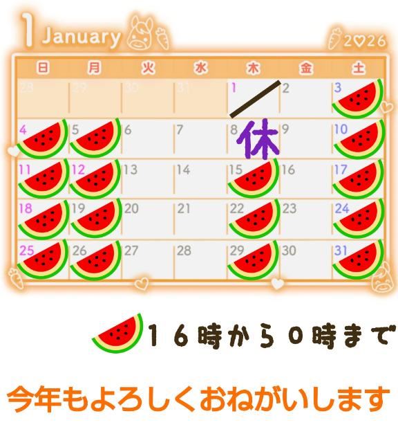 みなさまこんにちは今月の出勤予定表をつくりましたので載せさせていただきます。遅くなってしまい申し訳ありませんクララは普段月曜日木曜日土曜日日曜日に出勤させていただいております。今月はスイカのしるしがある日に出勤させていただきたいと考えています8日 木曜日は お休みをいただきます。直前でのご報告になってしまったことどうかおゆるしください今月はパレオではない格好をしたいなと思っています。きっと1か月間は新年な雰囲気になることでしょう他にもお休みなどの変更がありましたらわかり次第すぐに報告いたします。今年もよろしくおねがいします。女の子ページへ http://365diary.net/QUlyS1dML3R0L3N1aWthLzU1MTQzNDY0