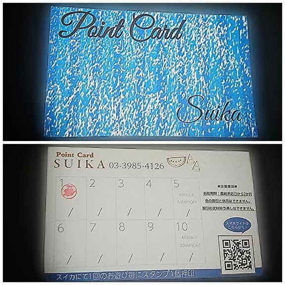 みなさまこんにちはお店スイカでは二種類のポイントカードをご用意しておりますひとつめはメールマガジンを登録してくださっている方専用のポイントカードそしてふたつめは非メルマガ会員の方専用のポイントカードです非メルマガ会員の方専用ポイントカードをご希望の方は受付で教えてくださいませ。全コース一律で1回のご来店につき1つスタンプを押させていただきます。スタンプを5個あつめていただくと60分コース以上のご利用で1000円割引です。スタンプが10個で60分コース以上のご利用2000円割引です。5個目と10個目のスタンプが押された日のみ割引が可能です。割引の持ち越しをすることができません。(他の割引と併用することができません。他の割引を優先する為にスタンプを当日追加するかしないかを選ぶこともできます)5個目と10個目の日は60分コース以上でのご利用をおねがいします。有効期限は最終来店日から2か月です。途中でメルマガ会員のポイントカードをつくってくださった場合非メルマガ会員のポイントカードでためていたポイントを移行することができません。ポイントスタンプは1回のご来店で1枚のカードに1個押させていただきます。どうかご注意ください。メルマガ会員のポイントカードと非メルマガ会員のポイントカードでは割引金額やご利用条件が異なります。もしお店スイカを好きになっていただけましたらぜひメールマガジンへの会員登録のご検討をおねがいします。女の子ページへ http://365diary.net/QmYzN1htL3R0L3N1aWthLzU1MTQzNDY0