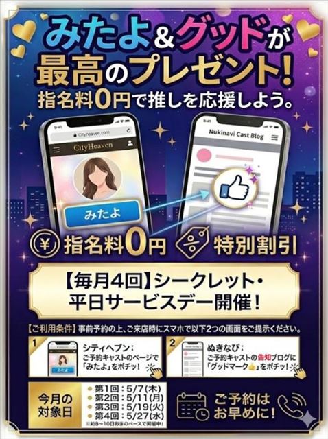 みなさまこんにちはお店スイカでは来月から毎月ひとつのイベントを開催することに決定しましたシークレット・平日サービスデー イベントですこのイベントは毎月ランダムに平日どこかの日に4回開催いたします来月5月は7日 木曜日11日 月曜日19日 火曜日27日 水曜日に イベントを行いますスイカの営業時間内で60分コース以上をご予約・ご利用でみなさまがご指名希望の おんなのこさんが書いた[イベント告知]日記へみたよ または いいねをしていただくと指名料金が無料です※ご利用日から1週間前までのイベント日記が有効です。受付でみたよ または グッドボタンを押してくださった日記画面をご提示ください。シティヘブン[みたよ]かぬきなび[グッドボタン]というサイトからイベント日記をお読みくださいシティヘブンはみたよぬきなびはグッドマークで いいねクララは来月5月11日 木曜日に 出勤させていただく予定です。5月7日 木曜日はお休みです。シークレット・サービスデーイベントは60分コース以上のご予約・ご利用おんなのこさんのイベント日記へのみたよ または いいねをしてくだった方が参加することができます。よろしければイベント日記のお見逃しや予約をお忘れないようにご注目ください。お願いいたします。女の子ページへ http://365diary.net/OUhUVW5BL3R0L3N1aWthLzU1MTQzNDY0