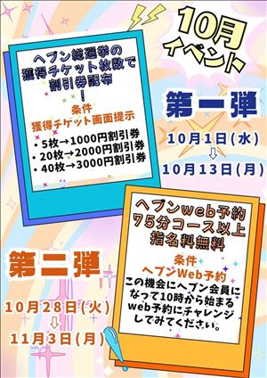 【スイカ🍉 10月イベントの案内🎉】  10月のイベントは大きく3つ。  ❶ 10/1-10/13ヘブン総選挙の獲得チケット枚数に応じて割引券を配布獲得枚数が・5枚   →1000円の割引券 ・20枚→2000円の割引券・40枚→3000円の割引券※12時以降※11/1-12/30迄の有効期限あり  ❷10/28-11/3(地方予選期間)ヘブンweb予約限定75分コース以上指名料無料※他の割引との併用は不可  ❸引き継ぎ口コミ割引「シティヘブン」・「ふうぞくじゃぱん」などで口コミ書いてくれた方には、割引があります。※割引率や条件など細かいので、各サイトにてご確認下さい  私が重要だと感じた箇所には太文字にしました。 始まりましたねシティヘブン選挙🗳️スイカでは、5名のキャストさんが参加しますので、是非是非 箱推しをお願いします☺️ また、午前中に来店される方は、キャンペーンではなく、 メルマガ会員専用のポイントカード発行がオススメです。そして、⚠️10/14(火)~20(月)の期間は、店全体のお休みになります。⚠️ ご不明な点は、スタッフまでお気軽にお問合せください😌  10月は季節は秋ですが、残暑厳しい月になるの可能性も、、💦 お店では 身体も心もサッパリ出来るかと思いますので、スイカを検討して下さると 嬉しいです☺️ ご来店 心よりお待ち申し上げております🌸 リン