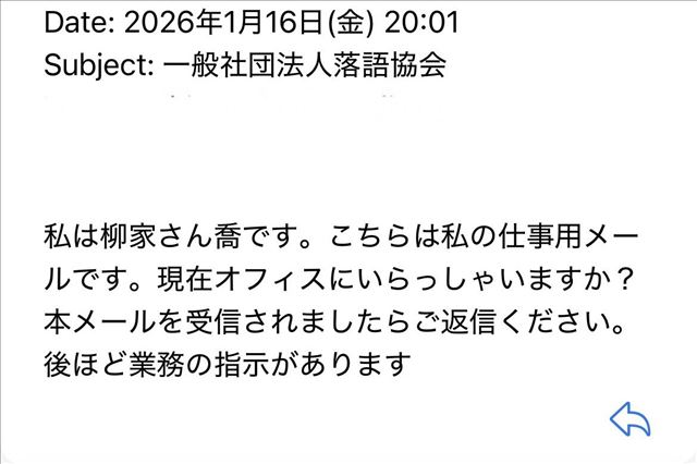 僕宛にさん喬会長からのメール。文面からして怪しい。楽屋でさん喬会長に念の為訊くと「僕じゃないよ。頼みたい事があれば柳枝さんに直接電話するよ」と。そりゃそうだ。「何の得が?」と楽屋一同首を傾げた。