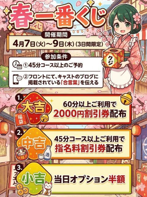【スイカ🍉4月イベントの案内🎉】  4月のイベントは大きく3つ。  ❶【予約と合言葉で♪春一番くじ】予約して、キャストのブログをチェックして合言葉を伝えてくれた方限定のチャンス! • 期間:4月7日〜9日(3日間)• 参加条件:以下の2つをクリアした方①45分以上のコースでご予約②フロントにて、キャストのブログに掲載されている「合言葉」を伝える• 特典内容: くじを引いて プレゼント次回 午後に使える割引券(大吉2000円引き・中吉 指名料無料)or 小吉 当日オプション半額  ❷【予約と当店のTikTokにイイネで♪くじ引きチャンス】当店のTikTokにイイネして、お得な特典をGETしよう! • 期間:4月21日〜23日(3日間)• 参加条件:以下の2つをクリアした方全員①45分以上のコースでご予約②当店のTikTokに「イイネ」をして、その画面をフロントで提示する• 特典内容: くじを引いて プレゼント次回 午後に使える割引券(大吉2000円引き・中吉指名料無料)or 小吉当日オプション半額  ❸ 引き継ぎ口コミ割引「シティヘブン」・「ふうぞくじゃぱん」などで口コミ書いむてくれた方には、割引があります。※割引率や条件など細かいので、各サイトにてご確認下さい  また、私が重要だと感じた箇所には太文字にしました。今回のキャンペーンは、珍しく45分コースから対象になりますので、是非 お使い下さい。午前中に来店される方は、キャンペーンではなく、 メルマガ会員専用のポイントカード発行がオススメです。ご不明な点は、スタッフまでお気軽にお問合せください😌   4月は 新学期や新生活など環境の変化で、心や身体が強張りやすい時。身体を温めて心をゆるかに整えるきっかけに、時間を作ってくださると嬉しいです。 皆さまのご来店を、心よりお待ち申し上げております🌸  白川 りん