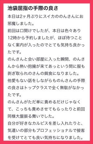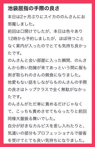 クチコミありがとうございます!(´▽`)いつき君へ!クチコミのお礼が大変遅くなりました(-人-)ツイッターからのご予約、ありがとうございました!2ヶ月ぶりの再会にびっくり!(リピートしてくれると思わなかったです汗)カルピス、喜んでもらえて僕も嬉しいです( *´艸`)お部屋に入ってからの熱い抱擁and追い剥ぎ展開こちらもテンション爆上がりでしたw手際の良さを褒めてもらえるのは本当に励みになります!(自分ではグダグダだと思ってるので汗)一方的ではなく一緒に盛り上ってくれる時間が最高に楽しいです(*´▽`*)事前のやり取りやお見送りのやり取りまで覚えてくれてて感謝!また大盤振る舞いコースで全力でお迎えいたします☆彡追伸クチコミ割引の期限は、9月19日までです(-人-)のん7月度、お店内の総合ランキング1位を初めて頂きました!大変恐縮ですが…「おめでとう~!」クチコミを頂けますと、、、とても励みになります(*・ω・)*_ _)ペコリ▼前日と当日のご予約は…03-3985-4126▼前々日までのご予約は下記URLをご参照くださいhttps://x.gd/MQEvU※他のサイトへの転送のため二重投稿しています。女の子ページへ http://365diary.net/Mml6UlBVL3R0L3N1aWthLzQ0ODkwNDYz