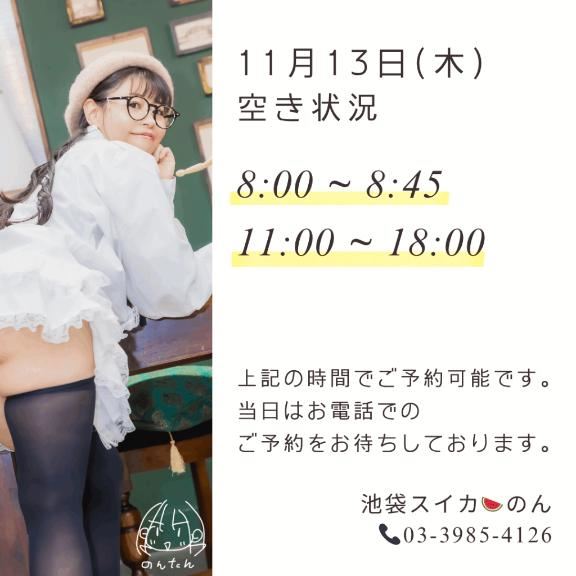 11/13(木) の空き状況をお知らせします!・8:00 ~ 8:45・11:00 ~ 18:00▼前日と当日のご予約は、お店まで…03-3985-4126▼前々日までのご予約は、下記URLをご参照ください。https://x.gd/MQEvU???????女の子ページへ http://365diary.net/SkxFSGZtL3R0L3N1aWthLzQ0ODkwNDYz