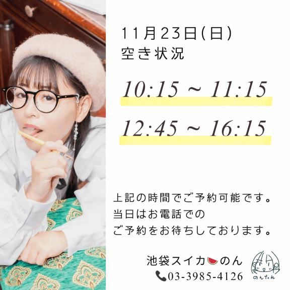 11/23(日) の空き状況をお知らせします☆・10:15 ~ 11:15・12:45 ~ 16:15▼前日と当日のご予約は、お店まで…03-3985-4126▼前々日までのご予約は、下記URLをご参照ください。https://x.gd/MQEvU女の子ページへ http://365diary.net/bVNsWFVLL3R0L3N1aWthLzQ0ODkwNDYz