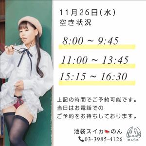 11/26(水) の空き状況をお知らせします☆・8:00 ~ 9:45・11:00 ~ 13:45・15:15 ~ 16:30▼前日と当日のご予約は、お店まで…03-3985-4126▼前々日までのご予約は、下記URLをご参照ください。https://x.gd/MQEvU女の子ページへ http://365diary.net/SWNGWHFuL3R0L3N1aWthLzQ0ODkwNDYz