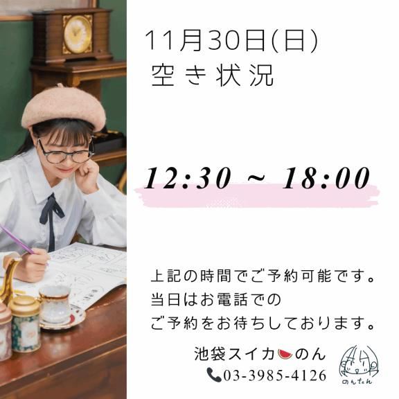 11/30 (日) の空き状況をお知らせします☆・12 : 30 ~ 18 : 00▼前日と当日のご予約は、お店まで…03-3985-4126▼前々日までのご予約は、下記URLをご参照ください。https://x.gd/MQEvU女の子ページへ http://365diary.net/ZUZzb21VL3R0L3N1aWthLzQ0ODkwNDYz