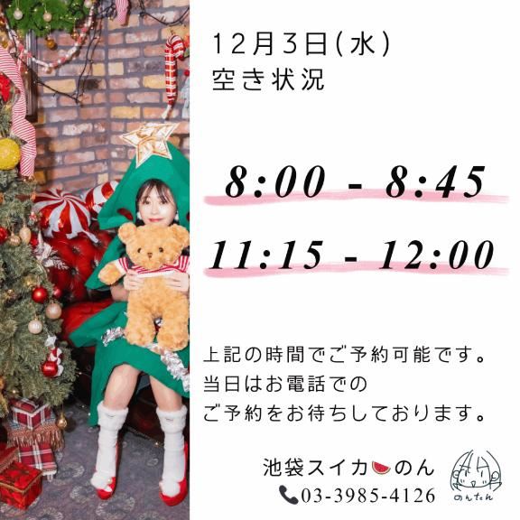 12/3(水) の空き状況をお知らせします☆・8 : 00 ~ 8 : 45・11 : 15 ~ 12 : 00▼前日と当日のご予約は、お店まで…03-3985-4126▼前々日までのご予約は、下記URLをご参照ください。https://x.gd/MQEvU女の子ページへ http://365diary.net/N2xWNFMwL3R0L3N1aWthLzQ0ODkwNDYz