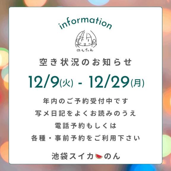 12/9(火) ~ 12/29(月) のスケジュールをまとめました!出勤日と空き状況を分かりやすくお届け☆ご予約・お問い合わせお待ちしております(*・ω・)*_ _)ペコリ---▼電話予約(営業時間内のみ)03-3985-4126---▼ネット予約(24時間受付中)https://x.gd/2D7f1---▼初見も古参も改めてご一読、お願いします(*・ω・)*_ _)https://x.gd/fS1pn---【ページのひらき方】① URLを長押し② コピー③ Safari / Chromeを開いて貼り付けこれで見れます!女の子ページへ http://365diary.net/djFhdFlsL3R0L3N1aWthLzQ0ODkwNDYz