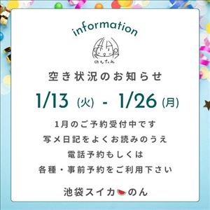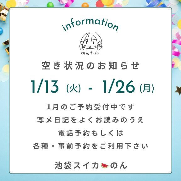 1/13(火) ~ 1/26(月) のスケジュールをまとめました!シフトと空き状況をお届けします~☆▼シフト▼空き状況---のんたんと直接やりとりして予約してくれた方限定---1月は 褌 - ふんどし -マっトが特典!!各メッセージツールか【のんびり屋】を使って予約してくれたら…褌 - ふんどし -?での 着衣マっト がオーダー出来ます!予約の際に1月の予約特典希望とコメントを添えてくださいm(_ _)mご予約・お問い合わせお待ちしております(*・ω・)*_ _)ペコリ---▼電話予約(営業時間内のみ)03-3985-4126---▼ネット予約(24時間受付中)https://x.gd/2D7f1---▼初見も古参も改めてご予約の際に下記ホームページをご一読、お願いします(*・ω・)*_ _)https://x.gd/fS1pn---【ホームページのひらき方】① URLを長押し② コピー③ Safari / Chromeを開いて貼り付けこれで見れます!【らいんの友達検索】@nontan で検索女の子ページへ http://365diary.net/QVNYS0pRL3R0L3N1aWthLzQ0ODkwNDYz