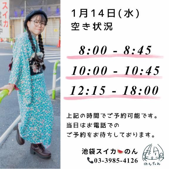 1/14(水) の空き状況をお知らせします☆・8 : 00 ~ 8 : 45・10 : 00 ~ 10 : 45・12 : 15 ~ 18 : 00---▼電話予約(営業時間内のみ)03-3985-4126---▼ネット予約(24時間受付中)https://x.gd/2D7f1---▼初見も古参も改めてご予約の際にご一読、お願いします(*・ω・)*_ _)https://x.gd/fS1pn---【ページのひらき方】① URLを長押し② コピー③ Safari / Chromeを開いて貼り付けこれで見れます!【らいんの友達検索】@nontan で検索女の子ページへ http://365diary.net/SlNIQlhEL3R0L3N1aWthLzQ0ODkwNDYz
