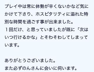 クチコミありがとうございます!(´▽`)やまこーさんへ!丁寧なクチコミをしたためてくださりありがとう…っ!そして、初めてのお店に僕を選んで下さったこと、本当に感謝です。当日思い立ってのご予約きっと緊張もあったと思いますがそんな中で特別な時間を過ごせたと言ってもらえてとても嬉しいです。せっかくの初体験を嫌な思い出で終わってほしくなくしつこく体勢が無理ないかを聞いてしまいすみません…汗そこをホスピタリティと感じて頂けたなら何よりです。(ホスピタリティとは縁遠い人間なのでそんなふうに捉えて頂き本人びっくり)「1回だけのつもりが、次を考えてしまう」その言葉、素直に胸に響きました。そしてそしてまさかの2回目もまた一緒に時間を過ごせたことメッセージを頂けたことクチコミを頂けたこと僕にとっても嬉しい出来事でした。(こんな親にも言えないような仕事なのに頑張ってやってて良かったーって心底思いました)これからも、緊張せず、安心して身を委ねられる場所でいられるように心がけます。またお会いできる日を楽しみにお待ちしております。(今度はすぐにという訳にはいきませんがまた行きますのメッセージもありがとうございました…っ!)のん---▼電話予約(営業時間内のみ)03-3985-4126---▼ネット予約(24時間受付中)https://x.gd/2D7f1---▼初見も古参も改めてご予約の際にご一読、お願いします(*・ω・)*_ _)https://x.gd/fS1pn---【ページのひらき方】① URLを長押し② コピー③ Safari / Chromeを開いて貼り付けこれで見れます!【らいんの友達検索】@nontan で検索女の子ページへ http://365diary.net/UVpuMkdLL3R0L3N1aWthLzQ0ODkwNDYz