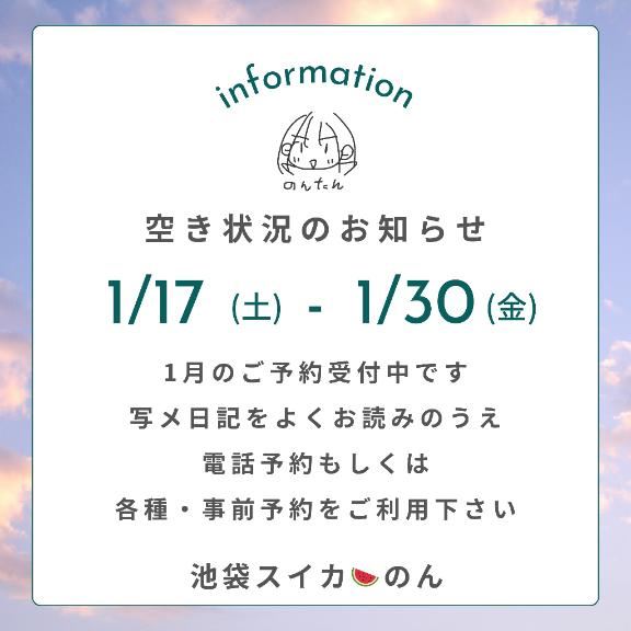1/17(土) ~ 1/30(金) のスケジュールをまとめました!シフトと空き状況をお届けします~☆▼シフト▼空き状況---のんたんと直接やりとりして予約してくれた方限定---1月は 褌 - ふんどし -マっトが特典!!各メッセージツールか【のんびり屋】を使って予約してくれたら…褌 - ふんどし -?での 着衣マっト がオーダー出来ます!予約の際に1月の予約特典希望とコメントを添えてくださいm(_ _)mご予約・お問い合わせお待ちしております(*・ω・)*_ _)ペコリ---▼電話予約(営業時間内のみ)03-3985-4126---▼ネット予約(24時間受付中)https://x.gd/2D7f1---▼初見も古参も改めてご予約の際に下記ホームページをご一読、お願いします(*・ω・)*_ _)https://x.gd/fS1pn---【ホームページのひらき方】① URLを長押し② コピー③ Safari / Chromeを開いて貼り付けこれで見れます!【らいんの友達検索】@nontan で検索女の子ページへ http://365diary.net/VTRYQnl1L3R0L3N1aWthLzQ0ODkwNDYz