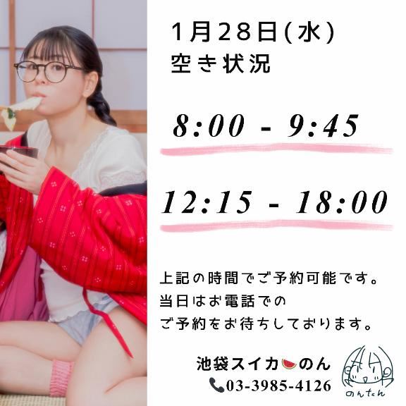 1/28(水) の空き状況をお知らせします☆・8 : 00 ~ 9 : 45・12 : 15 ~ 18 : 00---▼電話予約(営業時間内のみ)03-3985-4126---▼ネット予約(24時間受付中)https://x.gd/2D7f1---▼初見も古参も改めてご予約の際にご一読、お願いします(*・ω・)*_ _)https://x.gd/fS1pn---【ページのひらき方】① URLを長押し② コピー③ Safari / Chromeを開いて貼り付けこれで見れます!【らいんの友達検索】@nontan で検索女の子ページへ http://365diary.net/RWkyTTdvL3R0L3N1aWthLzQ0ODkwNDYz