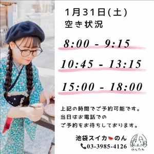1/31(土) の空き状況をお知らせします☆・8 : 00 ~ 9 : 15・10 : 45 ~ 13 : 15・15 : 00 ~ 18 : 00---▼電話予約(営業時間内のみ)03-3985-4126---▼ネット予約(24時間受付中)https://x.gd/2D7f1---▼初見も古参も改めてご予約の際にご一読、お願いします(*・ω・)*_ _)https://x.gd/fS1pn---【ページのひらき方】① URLを長押し② コピー③ Safari / Chromeを開いて貼り付けこれで見れます!【らいんの友達検索】@nontan で検索女の子ページへ http://365diary.net/S3JWU2lpL3R0L3N1aWthLzQ0ODkwNDYz