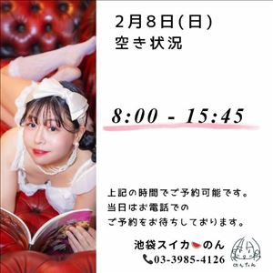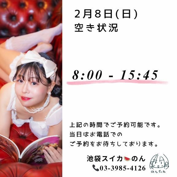 2/8(日) の空き状況をお知らせします☆・8 : 00 ~ 15 : 45---▼電話予約(営業時間内のみ)03-3985-4126---▼ネット予約(24時間受付中)https://x.gd/2D7f1---▼初見も古参も改めてご予約の際にご一読、お願いします(*・ω・)*_ _)https://x.gd/fS1pn---【ページのひらき方】① URLを長押し② コピー③ Safari / Chromeを開いて貼り付けこれで見れます!【らいんの友達検索】@nontan で検索女の子ページへ http://365diary.net/Z0RFeUFUL3R0L3N1aWthLzQ0ODkwNDYz