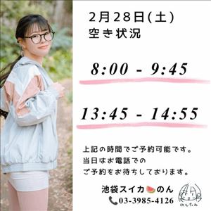 2/28(土) の空き状況をお知らせします☆・8 : 00 ~ 9 : 45・13 : 45 ~ 14 : 55---▼電話予約(営業時間内のみ)03-3985-4126---▼ネット予約(24時間受付中)https://x.gd/2D7f1---▼シフト、ご予約方法などは下記ホームページをご参照くださいhttps://x.gd/fS1pn女の子ページへ http://365diary.net/alhRREJoL3R0L3N1aWthLzQ0ODkwNDYz
