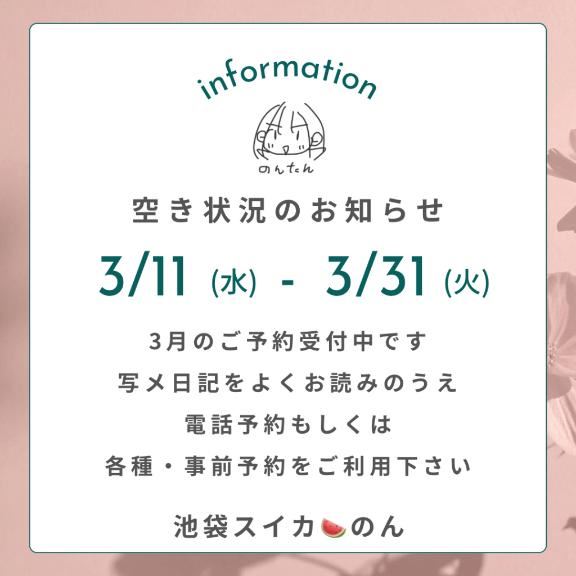 3/11(水) ~ 3/31(火) のスケジュールをまとめました!▼シフト▼空き状況---のんたんと直接やりとりして予約してくれた方限定---以下の着衣マっトが特典!!各メッセージツールか【のんびり屋】を使って予約してくれたら…白紺マイクロビキニ、体操着、スク水での 着衣マっト がオーダー出来ます!ご予約の際にどの予約特典が希望かのコメントを添えてくださいm(_ _)mご予約・お問い合わせお待ちしております(*・ω・)*_ _)ペコリ---▼電話予約(営業時間内のみ)03-3985-4126---▼ネット予約(24時間受付中)https://x.gd/2D7f1---▼シフト、ご予約方法などは下記ホームページをご参照くださいhttps://x.gd/fS1pn女の子ページへ http://365diary.net/Unl0c3B2L3R0L3N1aWthLzQ0ODkwNDYz