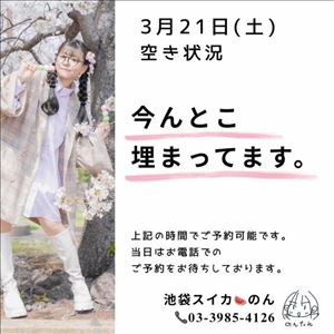 3/21(土) の空き状況をお知らせします☆前日までの推し活の兼ね合いで朝起きれる気がしないので、、、12時スタートになっています(*・ω・)*_ _)ペコリほんで…・今のとこ全枠埋まっています。?また変更が発生したらお知らせいたします。22日(日)に関してはまだ空き枠がありますので…何卒ご検討よろしくお願い申し上げますm(*- -*)m---▼電話予約(営業時間内のみ)03-3985-4126---▼ネット予約(24時間受付中)https://x.gd/2D7f1---▼シフト、ご予約方法などは下記ホームページをご参照くださいhttps://x.gd/fS1pn女の子ページへ http://365diary.net/Y0g5alZPL3R0L3N1aWthLzQ0ODkwNDYz