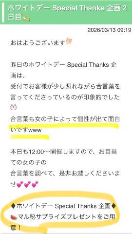 先日、お店でホワイトデーイベントがありました。写メ日記に書いた合言葉をフロントで伝えると指名料が無料になるという企画。こちらに記載のマル秘サプライズプレゼント実は女の子が貰う側でしたw急にお客さんが花持って階段降りて来るもんだから「わぁ( ・∇・)お花買ってきてくれたの??」「うん、最近6階に花屋ができてね」「Σ(・ω・ノ)ノえっ!」フロントで花渡してるの知らないもんだからビックリした事と…そのサプライズ企画を「6階に花屋ができたんだ」と粋な回答をしてきた お客さんにもツボりましたwwwお店もお客さんもサイコー過ぎるずっと笑っちゃった!めちゃ楽しかった!あと、どの女の子も合言葉が秀逸過ぎる。いっぱい合言葉にしたいワードがあるので、またやってほしいな!( *´艸`)女の子ページへ http://365diary.net/NFk5amlZL3R0L3N1aWthLzQ0ODkwNDYz