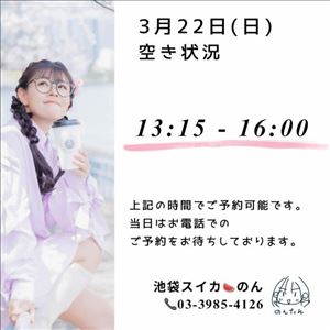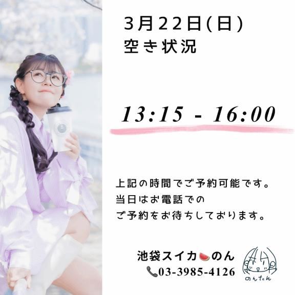 3/22(日) の空き状況をお知らせします☆・13:15 ~ 16:00です!午後は空いてますのでよろしくです(*・ω・)*_ _)ペコリ---▼電話予約(営業時間内のみ)03-3985-4126---▼ネット予約(24時間受付中)https://x.gd/2D7f1---▼シフト、ご予約方法などは下記ホームページをご参照くださいhttps://x.gd/fS1pn女の子ページへ http://365diary.net/QjdmbHJPL3R0L3N1aWthLzQ0ODkwNDYz