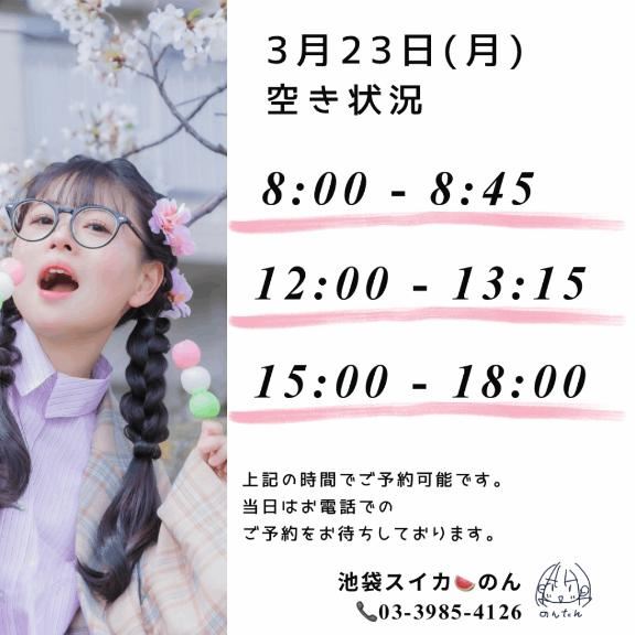 3/23(月) の空き状況をお知らせします☆・8:00 ~ 8:45・12:00 ~ 13:15・15:00 ~ 18:00?---▼電話予約(営業時間内のみ)03-3985-4126---▼ネット予約(24時間受付中)https://x.gd/2D7f1---▼シフト、ご予約方法などは下記ホームページをご参照くださいhttps://x.gd/fS1pn女の子ページへ http://365diary.net/Wnk0WEJCL3R0L3N1aWthLzQ0ODkwNDYz