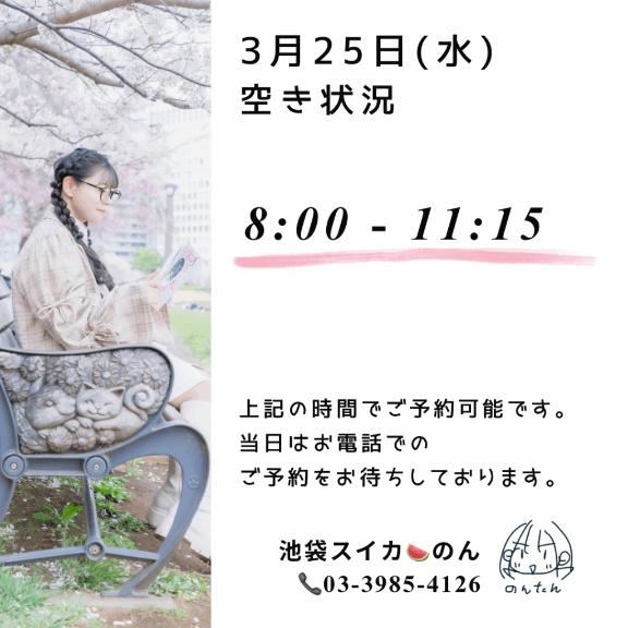 3/25(水) の空き状況をお知らせします☆・8:00 ~ 11:15?---▼電話予約(営業時間内のみ)03-3985-4126---▼ネット予約(24時間受付中)https://x.gd/2D7f1---▼シフト、ご予約方法などは下記ホームページをご参照くださいhttps://x.gd/fS1pn女の子ページへ http://365diary.net/Zmo1cHVxL3R0L3N1aWthLzQ0ODkwNDYz