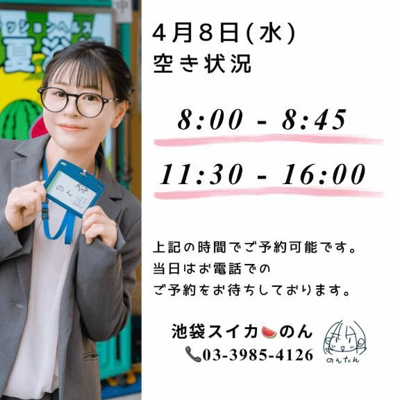 明日、4/8(水) の空き状況をお知らせします☆・8:00 ~ 8:45(8:00~8:30スタートは朝割対象)・11:30 ~ 16:00春一番くじイベントの合言葉は『ラン、ミキ、スー』です。言いづらかったら、画面を見せてください。オプション券が当たったらストッキングをプレゼントしてくれると嬉しいです!プレイ中に使わなくても普段履きします!---朝イチ空いてます!平日朝だけの「朝割」で【1,000円OFF】になります◎いつもよりちょっとお得にゆっくり過ごせる時間帯です(つ´∀`)つ出勤前でも夜勤明けでも|・ω・`)コッショリスーパーヌルヌルタイムしようぜ☆彡突然のご来店でもご予約でも◎ちなみに、9時半までのご案内で次回使える割引券プレゼント中です(*・ω・)*_ _)ペコリ---▼電話予約(営業時間内のみ)03-3985-4126---▼ネット予約(24時間受付中)https://x.gd/2D7f1---▼のんたんの自作HPはこちらhttps://x.gd/fS1pn???????女の子ページへ http://365diary.net/WWtjU0FHL3R0L3N1aWthLzQ0ODkwNDYz