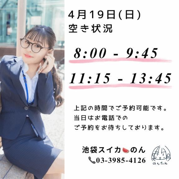 改めて、4/19(日) の空き状況をお知らせします☆・8:00 ~ 9:45・11:15 ~ 13:45---▼電話予約(営業時間内のみ)03-3985-4126---▼ネット予約(24時間受付中)https://tol-app.jp/s/nonbiriya---▼ライン予約(24時間受付中)https://lin.ee/tmC3POd---▼のんたんの紹介ページはこちらに書きました。https://x.gd/fS1pn---▼当日の空き状況はスイカの公式ページをご覧下さい。https://sp.suika-g.net/suika/girl/1683/女の子ページへ http://365diary.net/aERyM2VCL3R0L3N1aWthLzQ0ODkwNDYz