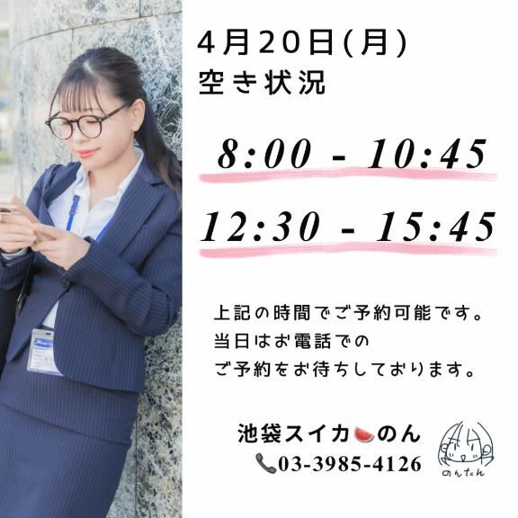 420(月) の空き状況をお知らせします☆・8:00 ~ 10:45・12:30 ~ 15:45---▼電話予約(営業時間内のみ)03-3985-4126---▼ネット予約(24時間受付中)https://tol-app.jp/s/nonbiriya---▼ライン予約(24時間受付中)https://lin.ee/tmC3POd---▼のんたんの紹介ページはこちらに書きました。https://x.gd/fS1pn---▼当日の空き状況はスイカの公式ページをご覧下さい。https://sp.suika-g.net/suika/girl/1683/女の子ページへ http://365diary.net/Znd3eUdFL3R0L3N1aWthLzQ0ODkwNDYz