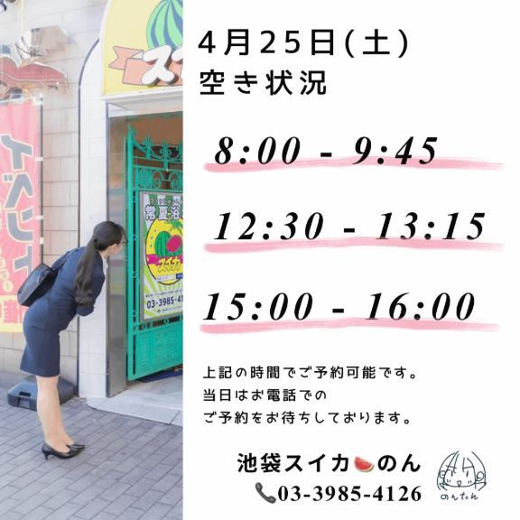 明日、4/25(土) の空き状況をお知らせします☆・8:00 ~ 9:45・12:30 ~ 13:15・15:00 ~ 16:00---▼電話予約(営業時間内のみ)03-3985-4126---▼ネット予約(24時間受付中)https://tol-app.jp/s/nonbiriya---▼ライン予約(24時間受付中)https://lin.ee/tmC3POd---▼のんたんの紹介ページはこちらに書きました。https://x.gd/fS1pn---▼当日の空き状況はスイカの公式ページをご覧下さい。https://sp.suika-g.net/suika/girl/1683/女の子ページへ http://365diary.net/TXFBT2tJL3R0L3N1aWthLzQ0ODkwNDYz
