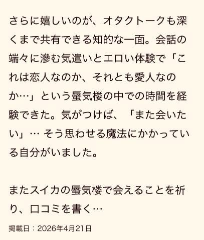 クチコミありがとうございます!(´▽`)バンドTおじさんへ!3回目のご来店?あれ?まだ3回目だったっけwww全然、ご無沙汰感ないの何故w普段のやり取りのせいか???「新鮮なのに熟成されていく」って表現ワインかよって...僕的には肉かな。熟成肉???笑トークもプレイも感じ取ってもらえてるのが伝わってきて年1~2くらいだけどスイカに来る時間をちゃんと大事にしてくれているんだなと嬉しくなりました。その場で流れを組み立ててるというよりバンドTおじさんにコールandレスポンスしてるとフリーダムに動けるって感じです!ヲタクトークも含めてあの“蜃気楼みたいな時間”を一緒に楽しめてるのはこちらにとっても特別な時間です。普段の生活で綾波現象が起きないか心配ですが。友達か?恋人か?愛人か?自分的にはクラスメイトでもない秘密基地だけでしか遊ばない本名も知らない誰か的な?その曖昧な感じも含めてまた次も一緒に味わえたら嬉しいです( *´艸`)またスイカの蜃気楼でお会いできるのを楽しみにしてます。今度は年末か来年かな???それまで頑張りますっ!!!Uberのクーポン早速使った笑 ありがと!のん???????女の子ページへ http://365diary.net/bml3MnU5L3R0L3N1aWthLzQ0ODkwNDYz