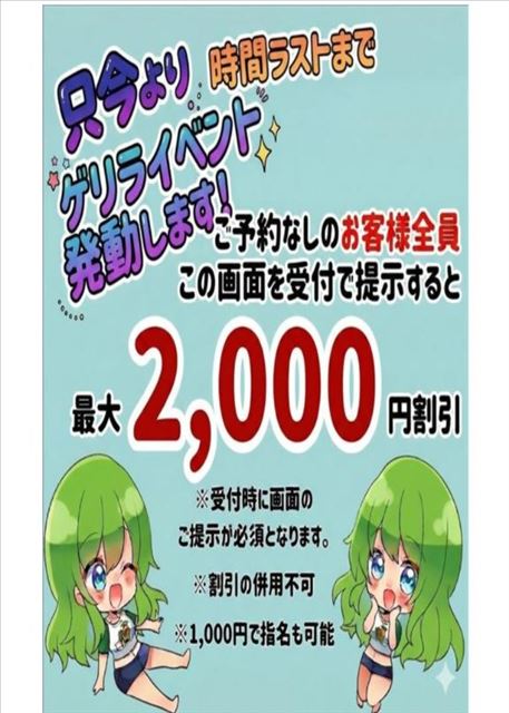 只今、ゲリライベントやってまーすといっても受付終了まで、あと2時間です!お仕事帰りの方、ご近所の方、月曜日からお元気な方、是非遊びにきてください女の子ページへ http://365diary.net/Z3l6ajd3L3R0L3N1aWthLzQ2MzQxMTY5