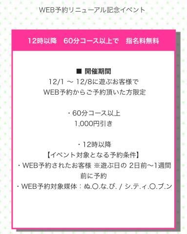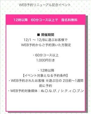 ??12/1~12/8までの1週間お得なイベントやってるよ???12時以降で60分以上だと1000円引きだってさ!=午前中と同じ料金ってこと!???ネット予約限定のイベントなのでぜひ活用してください?????ぬ〇なびが私は分からないので。笑普通にヘブンの予約でも大丈夫なのでよろしくお願いします!私は今日からしばらく休みなので12/6と7の予約待ってます!12月この業界いわゆる繁忙期なので部屋が埋まっちゃうと希望の女の子が空いててもご案内できません??これは店舗型あるあるなので予約して部屋を確保しましょう!???女の子ページへ http://365diary.net/MGlPTVh3L3R0L3N1aWthLzYyNDY3Mzc1
