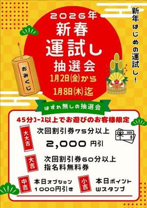 おはようございます!お正月2日目ですね♪私は今日から仕事始めですまだ入店して1か月半ほどですが今年もどうぞよろしくお願いしますね?お兄さんはもう初詣は行きましたか?今日行くという方も多いのかな?初詣の帰りに、遊びに来てくれたら嬉しいな?お店で待ってるね(*^^*)お得な年始イベントもやっているのでぜひ!??????????????????????????謹賀新年!新春☆運試し抽選会開催?新年最初の運試し!2026年のスタートを祝して、ハズレなしの豪華抽選会を開催いたします?? 開催期間1/2(金) ~ 1/8(木)? 参加条件45分コース以上でご利用のお客様限定気になる抽選内容は…はずれ無し!!大大吉~小吉の4枚のおみくじカードを引いていただき、該当の割引を適用!?大大吉次回75分以上で2,000円引き?大吉次回60分以上で指名無料?中吉本日 オプション1000円引き?小吉本日 ポイント2倍女の子ページへ http://365diary.net/RXRHbm5LL3R0L3N1aWthLzYyOTA0NDQy