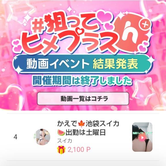 昨日の深夜まででしたヒメチャ◯ネルのイベント!見事4位に終わりました3位以内には入れなかったけど…皆様の熱い気持ちのおかげでこんなに素敵な順位を頂けて(AKB総選挙風)本当に本当にありがとうございました10月末からはヒメチャ◯ネル総選挙もあるのでそちら始まったら是非是非応援して貰えたら嬉しいですヒメチャ◯ネルってそもそも何?美味しいの?って方は是非コチラから辿れますので一度見てみてね~↓https://lit.link/kaede0107suika色々なイベント出てるのでログボで良いので是非応援してもらえたら嬉しいです女の子ページへ http://365diary.net/Q0dyWmZOL3R0L3N1aWthLzI4Nzc2MTg5