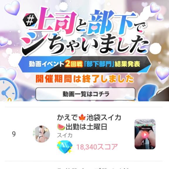 アチラ界隈の皆さまへのお礼アチラ界隈…ヒメチャ◯ネルのことです毎週のようにイベントに出てるのですが今回出ていた動画イベント上司と部下でシちゃいました部下部門なんと9位に入れました~いつもたくさんの愛を下さって本当に本当にありがとうランクイン出来ると本当嬉しいね皆さまの毎日のコツコツの賜物です!これからもイベント出ていきますし今日も新しくクリスマスのやつ(ヘルス部門)出ましたので、疲れない程度に応援してもらえたら嬉しいですでは、これからもよろしくお願いします女の子ページへ http://365diary.net/dzBla2ltL3R0L3N1aWthLzI4Nzc2MTg5