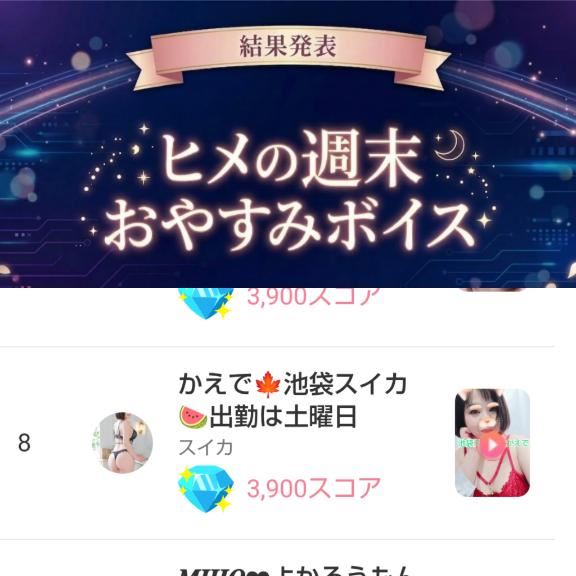 アチラ界隈の話です先週末の短期決戦イベントこちらで、なんと8位になりました入れると思ってなかったからビックリしました~いつもひっそりと忍者のようにかえでを応援して下さる方々!皆様のおかげです本当に本当にありがとうー!遅れてきたホワイトデーかな?嬉しかったですありがとうございますそしてそして!現在出ているこちらもなんと10位以内で踏ん張っております!良かったらログボで結構ですので応援して下さると嬉しいですさっきから何の話をしているの?って方はよかったら下記のリンクからヒメチャ◯ネルを辿ってみて下さい↓https://lit.link/kaede0107suikaではでは、この後いつものマイガール限定動画をアップしてから寝るね~そちらもよろしくです女の子ページへ http://365diary.net/ZkVnN2dtL3R0L3N1aWthLzI4Nzc2MTg5