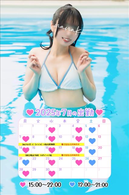 暑い時こそぬるぬるスプラッシュ 7月のシフト&割引情報~をお知らせしたいななこです 【指名料無料イベント】7/7月~7/11(金)“ぬ.き.な.び”のキャストブログに『イイネ』を押して指名料無料※12時以降、60分コース以上🎁次回使える指名料無料券をプレゼント 【ポイント2倍キャンペーン】7/14(月)~7/18(金)『前日電話予約』でポイント2倍当店の2種類のポイントカードどちらでも可※12時以降、60分コース以上🎁次回使える指名料無料券をプレゼント  【口コミで無料指名料】『シティ.ヘブン』 複数枠適応『口コミ.情報.局』 複数枠適応『ぬ.き.な.び』 60分以上一律2000円引き※12時以降、60分コース以上  7月も汗だくになりながら皆さまとエロいいお時間を過ごしたいです 皆さまがお待ち時間なくお得にお遊びできますように     https://lit.link/nanako75suika各種SNSやサイトはこちらから姫予約は『ヘブンのトーク』『XのDM』『LINE』でお受けしています  6月の割引情報https://www.suika-g.net/suika/girl/403/blog/2056380.html